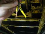 左右の灯篭にコードを通す。一旦、仏壇にぶら下げてみて、コードの長さをカットするなり、調節し、心線を束ねる。テープは印です。